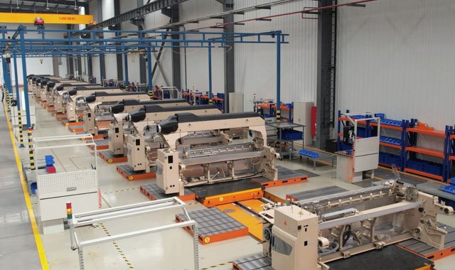 海佳現(xiàn)代化智能總裝車間是國際著名設(shè)計(jì)公司為海佳機(jī)械定制設(shè)計(jì)的全球首個(gè)織機(jī)脈動(dòng)式裝配生產(chǎn)線體。整個(gè)總裝車間由平臺(tái)安裝區(qū)、脈動(dòng)線組裝區(qū)、模組組裝區(qū)、試機(jī)平臺(tái)區(qū)四個(gè)部分組成。整個(gè)裝配過程的物料運(yùn)轉(zhuǎn)和配送,全部由AGV和RGV系統(tǒng)自動(dòng)調(diào)度,整條線體除了整機(jī)裝配外,全部實(shí)現(xiàn)自動(dòng)化生產(chǎn)。目前線體承擔(dān)的是海佳噴水織機(jī)和噴氣織機(jī)的裝配,單班每天的產(chǎn)量在21-22臺(tái)。